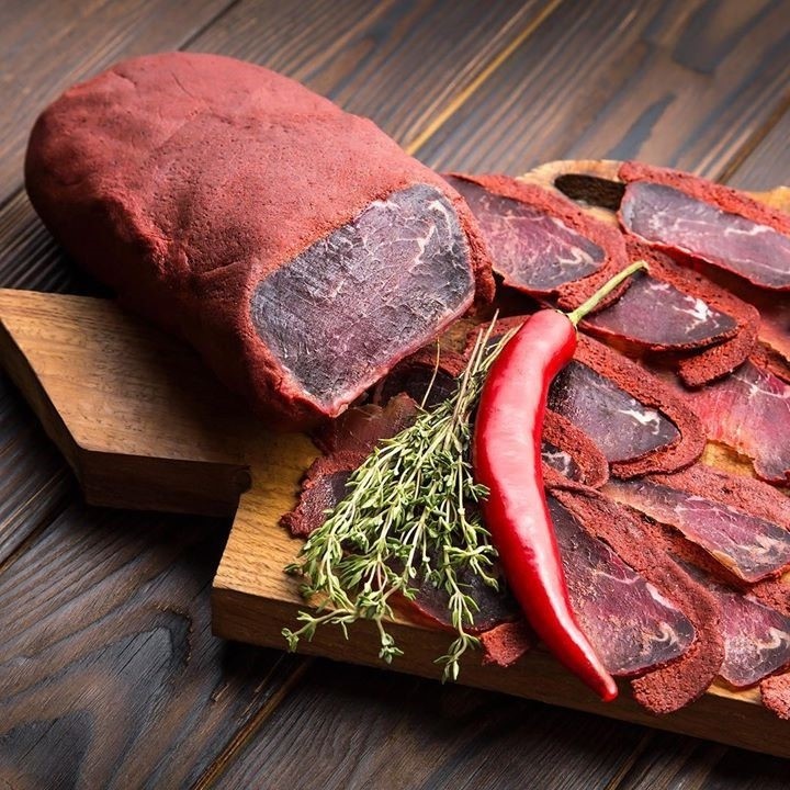 Описание: Бастурма - вяленая в пряностях говядина. Очень острая и пряная оболочка из специй, мясо очень нежное и легко режется. Продукт из говядины предназначен для употребления в пищу как в роли самостоятельного блюда, так и в качестве закуски.