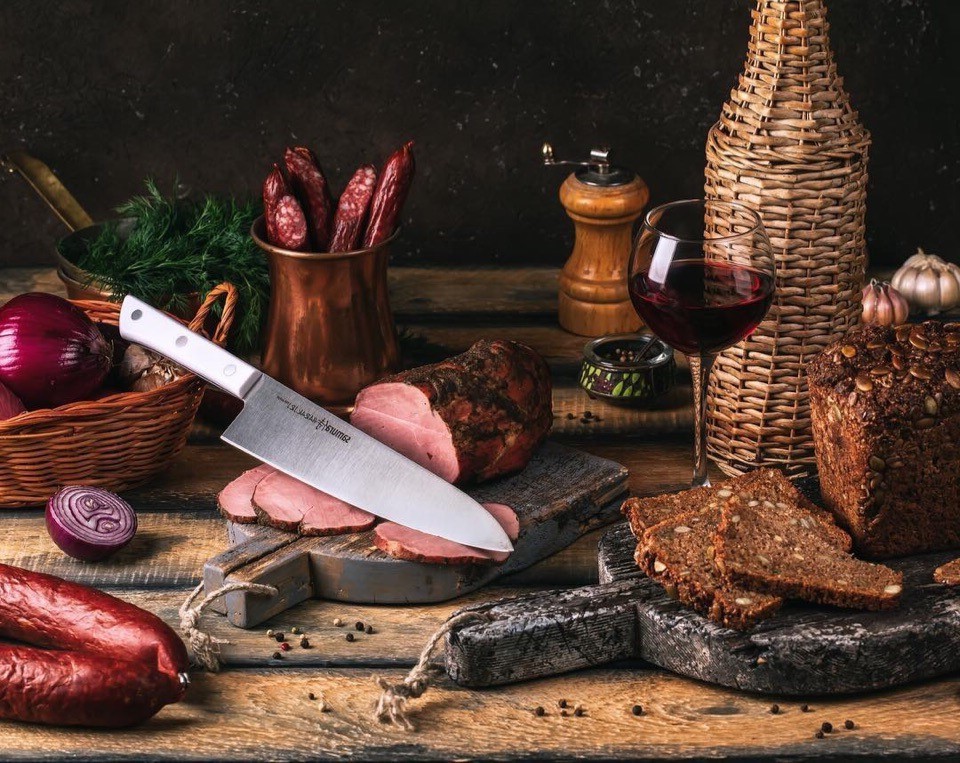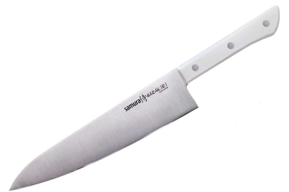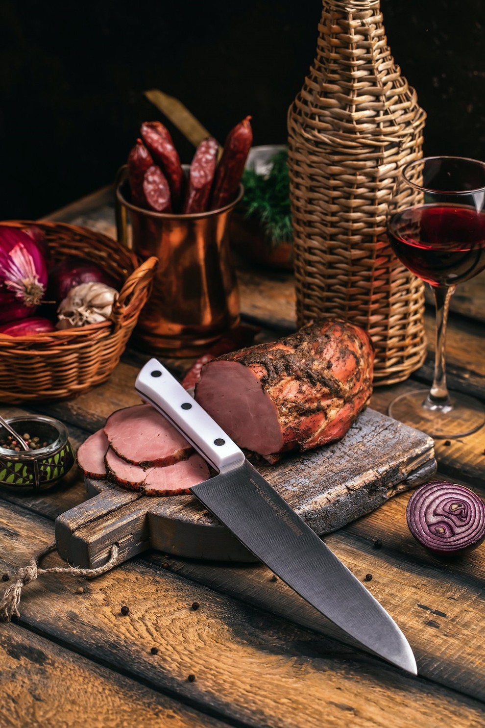 Описание: Классический шеф нож Samura – один из распространённых инструментов на каждой кухне. Острое, как бритва лезвие легко справится с овощами и мясной бакалеей. Эргономичная рукоятка ножа будет радовать вас не один год.