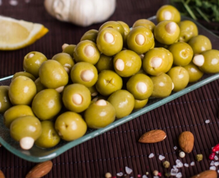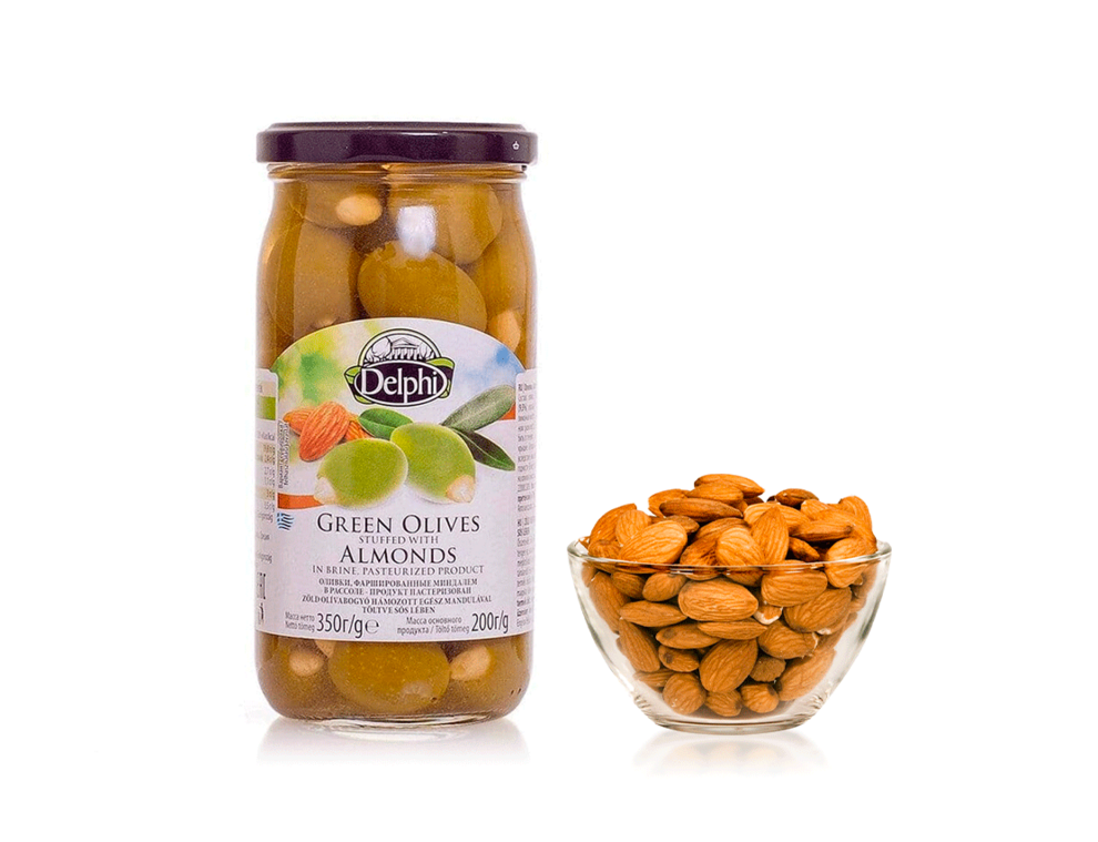 Описание: Это длинные, овальные оливки без косточек фаршированные миндалём. Специально сделаны для гурманов, которые хотят попробовать что-то новое. Сочетание вкусов не оставят вас равнодушными.