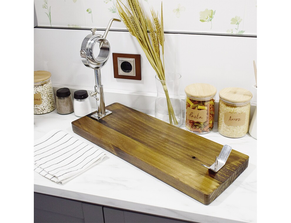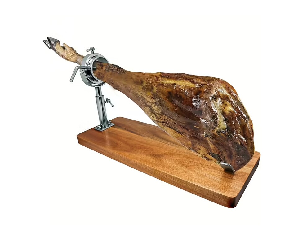 - Поворотное кольцо из нержавеющей стали надёжно фиксирует ногу хамона, обеспечивая большую свободу движений и облегчая нарезку мяса.